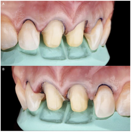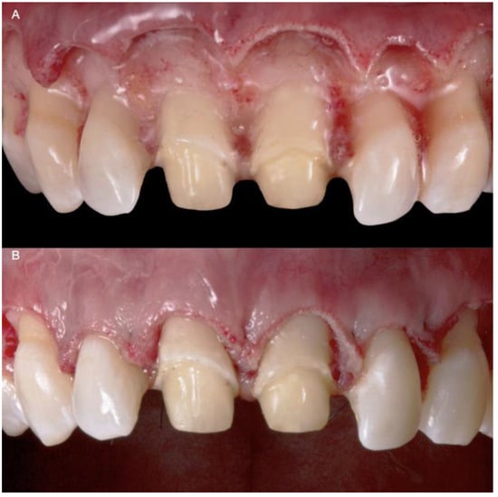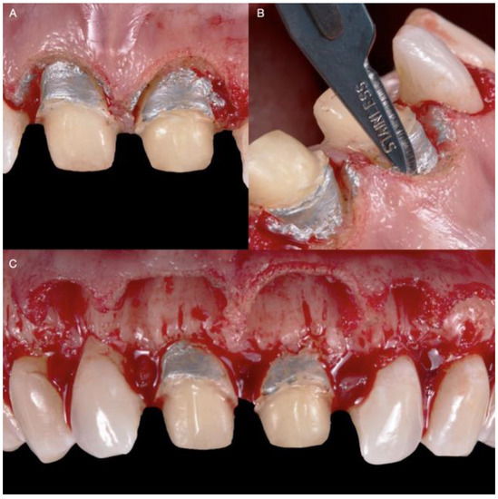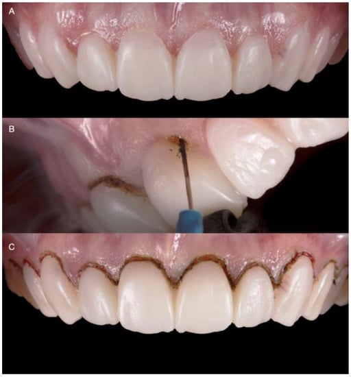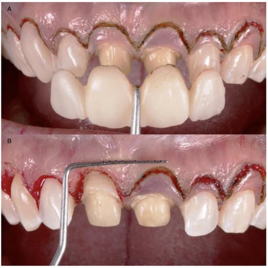 The gingival architecture surrounding natural teeth or dental implants is an important component of aesthetics in the anterior region [1,2,3]. When the natural dentition lacks symmetry or has poor gingival architecture, these conditions can markedly alter the harmony of the dentition [4]. In recent years, it has become common for patients to have high aesthetic demands, going beyond a simple desire for a smile makeover [5,6,7,8]. Thus, clinicians must aim for an optimal gingival architecture during treatment [9]. Crown lengthening can be used in several clinical situations, such as excessive gingival display or a “gummy smile”, teeth with an inadequate amount of tooth structure, or short clinical restorations [10]. In these cases, crown lengthening can re-establish the gingival architecture and enhance the restorative outcome.