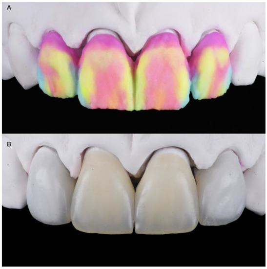 The final master cast was fabricated with type IV stone (Fujirock, GC, Tokyo, Japan). Restorations, fabricated following the contours of the diagnostic wax-up, were made of refractory feldspathic porcelain (Noritake Super Porcelain EX-3, Kuraray Noritake Dental, Tokyo, Japan) for the veneers and full-coverage crowns (Figure 8).
