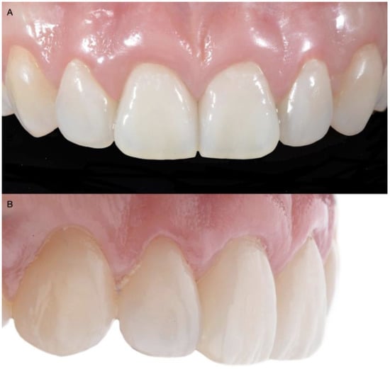 A try-in of the final ceramic restorations was performed to evaluate the fit and contours, and the patient approved the final appearance. For bonding the ceramic restorations, isolation was provided via rubber dam placement. The teeth were air-abraded with 20-micron aluminum oxide particles (AquaCare Aluminium Oxide Air Abrasion Powder, Velopex, London, UK). The teeth receiving veneers were surface treated with 37% phosphoric acid (Total Etch, Ivoclar Vivadent, Schaan, Liechtenstein) for 15 s and then rinsed with water. A primer (Syntac Primer, Ivoclar Vivadent, Schaan, Liechtenstein ) was applied, and any excess was gently removed with air. Adhesive (Syntac Adhesive, Ivoclar Vivadent, Schaan, Liechtenstein) was applied, and any excess was removed with air according to the manufacturer’s recommendations. The intaglio surfaces of the ceramic restorations were etched with 5% hydrofluoric acid (IPS Ceramic Etching Gel, Ivoclar Vivadent, Schaan, Liechtenstein) for 60 s, and Monobond Plus (Ivoclar Vivadent, Schaan, Liechtenstein) was applied to the etched surfaces. Light-cure resin luting cement (Variolink Esthetic LC, Ivoclar Vivadent, Schaan, Liechtenstein) was applied to the veneers, and they were seated. Excess cement was removed, and the restorations were cured using an LED light-curing unit (VALO Cordless, Ultradent, South Jordan, UT, USA) on each surface (facial, palatal, mesial, and distal) for 20 s. The crowns were cemented with a dual-cure resin luting cement (Panavia V5, Kuraray Noritake Dental, Tokyo, Japan) and light-cured, followed by applying appropriate pre-treatments to the teeth and ceramic restorations.