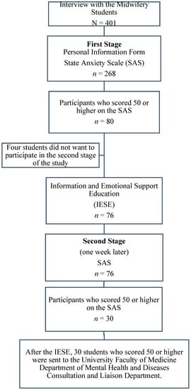 The second stage of the study was conducted with 76 students who had high anxiety levels and who agreed to proceed. Four students left the study at this point. Dates and video call platforms suitable for the students were determined through individual interviews. The students were provided with at least 60 min of Individualized Information and Emotional Support Education (IESE) by the researchers between 1 and 12 June 2020. One week after the IESE was provided to each student, between 20 and 27 June 2020, the State Anxiety Scale (SAS) was administered again by sending links to the students’ social media accounts (Instagram, WhatsApp and Facebook) and e-mail addresses using Google Forms (https://forms.gle/FuVAwGYNCZfxSakEA accessed on 20–27 June 2020). After the second measurement, 30 students who scored 50 or higher on the SAS were sent to the University Faculty of Medicine Department of Mental Health and Diseases Consultation and Liaison Department (Figure 1).