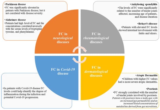 Calprotectin (CP) is a dimer composed of S100A8 and S100A9, which are calcium and zinc binding proteins. CP is found mainly in neutrophils, where under constitutive conditions, it represents about 45% of the total cytosolic protein. Moreover, calprotectin is constitutively expressed by monocytes, macrophages, dendritic cells oral keratocytes and squamous mucosal epithelium. In inflammation, the expression of calprotectin is increased. CP is released by neutrophils, monocytes, and macrophages [1] during inflammation due to its antimicrobial properties. CP can be detected in serum, urine, cerebrospinal, synovial, and pleural fluids in proportion to the degree of any existing inflammation, but the most useful and widely used form is in stool as a reliable marker of intestinal tissue inflammation [2]. Moreover, CP concentration in feces is approximately six times higher than in plasma. Elevated levels of fecal calprotectin (FC) can be detected in both primary gastrointestinal disorders and extraintestinal diseases [3]. FC can be easily measured by enzyme-linked immunosorbent assay (ELISA) [4]. FC is elevated in over 95% of patients with inflammatory bowel disease (IBD) and correlates with clinical disease-activity [5]. FC has high specificity and sensitivity in predicting clinical relapse [5]. Elevated levels of FC have also been found in patients with NSAID-induced enteropathy [6] and used for the diagnosis of colorectal cancer [7]. It is also a useful test to differentiate between abdominal pain secondary to IBD and irritable bowel syndrome (IBS) [4,5]. Recent evidence suggests that intestinal inflammation correlates with dermatologic, neurologic, and rheumatologic diseases [8,9]. In fact, the intestinal mucosa and the skin are barriers that share many similarities. Both the skin and the gut are in contact with the environment and are the first line of defense against external agents and pathogens. Both are rich in immune cells and are colonized by microbial cells [8]. Both are niches for fungi, viruses and especially bacteria, which are essential for metabolic and immune functions. The gut–skin axis can be considered an integral part of the gut–brain–skin axis [9,10]. In addition, research on the role of gut microbiota and its correlation with brain function and neurological disorders has increased. The imbalanced composition of gut microbiota observed in these diseases, with an overexpression of proinflammatory bacteria determine an increase of leaky gut that may contribute to intestinal inflammation [11,12]. Similarly, the human microbiome is a key factor in the development of autoimmune and rheumatologic diseases due to its involvement in immune homeostasis [11,13]. This review focuses on the important role of FC in many extra gastrointestinal diseases from rheumatologic to dermatologic to neurologic ones to the recent SARS CoV-2 infection Figure 1.