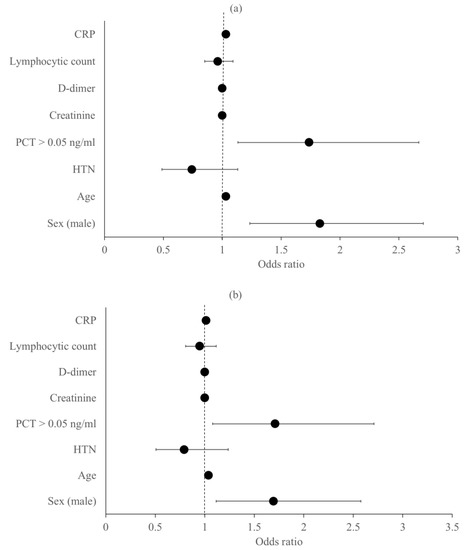 - Liu, Z.M.; Li, J.P.; Wang, S.P.; Chen, D.-Y.; Zeng, W.; Chen, S.-C.; Huang, Y.-H.; Huang, J.-L.; Long, W.; Li, M.; et al. Association of procalcitonin levels with the progression and prognosis of hospitalized patients with COVID-19. Int. J. Med. Sci. 2020, 17, 2468–2476. [Google Scholar] [CrossRef]