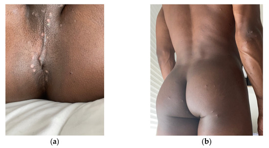 (a) Papular and vesicular skin lesions affecting the anal and perineal region. (b) Singular papules, vesiculae or pustules on glutes and arms.