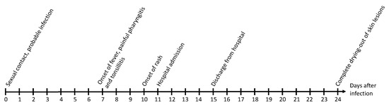 We recommended isolation until complete recovery of the skin lesions upon discharge. Antibiotic therapy was discontinued when the tonsillitis improved and serology for Treponema pallidum was unsuggestive of acute infection. The patient reported a complete recovery when followed up by telephone calls. The skin lesions completely resolved 18 days after the first symptoms and quarantine was lifted by local authorities according to German regulations. The time course of the monkeypox infection is shown in Figure 3.