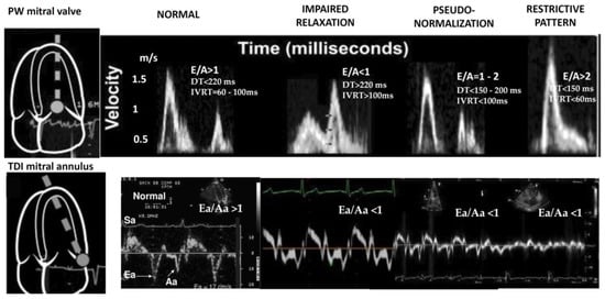 - Nagueh, S.F.; Smiseth, O.A.; Appleton, C.P.; Byrd, B.F., 3rd; Dokainish, H.; Edvardsen, T.; Flachskampf, F.A.; Gillebert, T.C.; Klein, A.L.; Lancellotti, P.; et al. Recommendations for the Evaluation of Left Ventricular Diastolic Function by Echocardiography: An Update from the American Society of Echocardiography and the European Association of Cardiovascular Imaging. J. Am. Soc. Echocardiogr. 2016, 29, 277–314. [Google Scholar] [CrossRef]