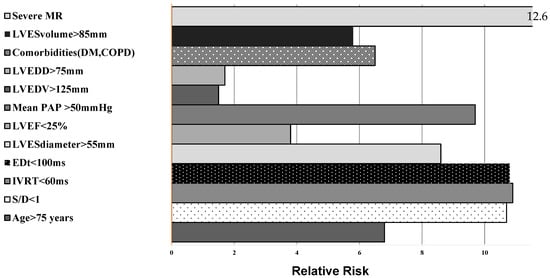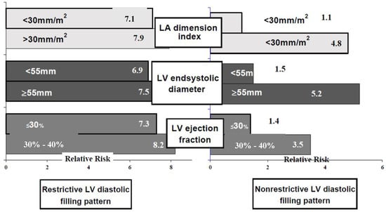 - E-wave deceleration time <100 ms (RR = 10.8, r = 0.75, p < 0.05);