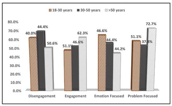 The comparison of COPE-60 questionnaire results stratified by the age of participants identified that patients in the 30–50 age group were more likely to use negative coping mechanisms such as disengagement (69.4%), although they were less emotion-focused (56.1%). Older patients were more likely to use positive coping mechanisms such as engagement and problem-focused coping, as seen in Table 3. The young patients used more emotion-focused coping mechanisms when dealing with their disease (65.0% vs. 56.1% vs. 44.2%, p-value = 0.020), as presented in Figure 1.