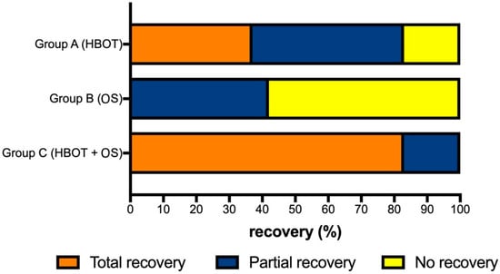 Women recovered better (ANOVA: p < 0.05) compared to men (women’s PTAv average showed lower scores than men’s). The better results were achieved by using HBOT + OS (HB: p = 0.001) compared to HBOT or OS and HBOT (HB: p < 0.05) versus OS. HBOT + OS (HB: p = 0.04) was better than HBOT only.