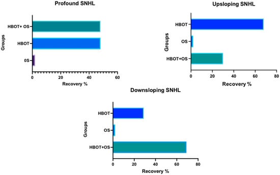 The graphs show the prevalence of recovering comparing the groups. Profound SNHL recovers same comparing HBOT alone or combined with OS; the Upsloping SNHL recovers better by HBOT alone than HBOT + OS; finally, Downsloping SNHL recovers better using HBOT + OS compared to HBOT only. In all cases, OS as single treatment is not sufficient to recover.