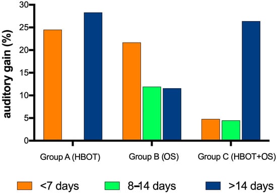 The graph shows the differences in the recovery at different time points among the three groups. HBOT and HBOT + OS allow to improve the hearing functions even after more than 15 days from the hearing loss onset.