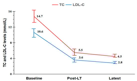Changes in serum TC and LDL-C levels over time. Baseline levels were obtained in the immediate preoperative period. Post-LT levels were defined as those measured at normalization, first discharge, or one month following LT, whichever occurred first. The latest levels were obtained at the time of the last follow-up. Significant decreases in postoperative serum TC and LDL-C levels were noted. Post-LT TC levels: mean 5.5 mmol/L versus baseline levels: mean 14.7 mmol/L; p < 0.001. Latest TC levels: mean 4.5 mmol/L versus baseline levels: mean 14.7 mmol/L; p = 0.001. Post-LT LDL-C levels: mean 3.6 mmol/L versus baseline levels: mean 10.6 mmol/L; p < 0.001. Latest LDL-C levels: mean 2.8 mmol/L versus baseline levels: mean 10.6 mmol/L; p = 0.001. LDL-C low-density lipoprotein cholesterol, LT liver transplantation, TC total cholesterol.