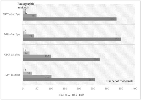 | Total, n, and (%) of detected radiolucencies by DPR/CBCT | 350/334 89/83 (%) | 39/49 10/12 (%) | 6/20 1/5 (%) | 395/403 100 (%) |