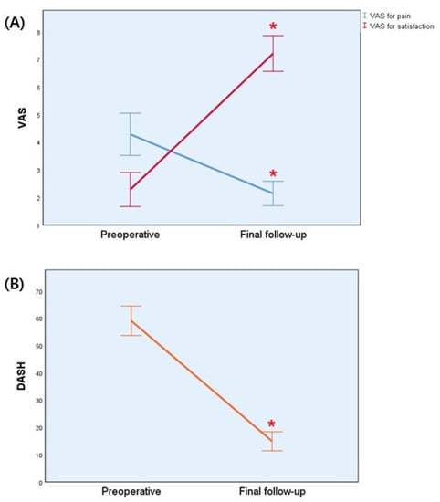 Graph showing functional outcomes at preoperative and final follow-up period; (A) VAS scores for pain (blue) and satisfaction (red) (B) DASH score (yellow). * p < 0.05. Error bars represent 95% confidence intervals. VAS: visual analog scale; DASH: Disabilities of Arm, Shoulder and Hand.