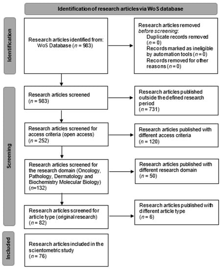 We conducted a scientometric research study based on the available scientific literature by searching the Web Of Science (WoS) database. The WoS database was searched by defining our main research items. We established that the main research items were “squamous cell carcinoma”, “skin”, and “immunohistochemistry”. The research items were selected based on the scientometric algorithm of the research in order to organize our research target. In the WoS, the advanced search option was selected, and the query terms were set to “All fields” with the Boolean “and” value. The query for the study was: “((ALL = (Squamous cell carcinoma)) AND ALL = (skin)) AND ALL = (immunohistochemistry)”. Following the interrogation, a total of 983 articles were presented. The inclusion criteria of the articles in the present study were based on certain publication years (2017–2022), access policy (open access), research domain (oncology, pathology, dermatology, and biochemistry molecular biology), and article type (original research). The exclusion criteria were based on the values of the inclusion criteria outside the established range. The PRISMA diagram (Figure 1) shows the workflow for refining our results. After applying all the inclusion and exclusion criteria, a total of 76 articles were selected for further processing throughout our study. For assessing the impact of and to establish the research directions for squamous cell carcinomas, we used the scientometric method [,]. A set of instructions was defined based on the keywords from the 76 articles we assessed [,,,,,,,,,,,,,,,,,,,,,,,,,,,,,,,,,,,,,,,,,,,,,,,,,,,,,,,,,,,,,,,,,,,,,,,,,,,]. In order to obtain a valid research database of articles, the citations of the articles included in our study were analyzed with a threshold minimum of 2 citations/articles. The first five articles with the most citations were analyzed. For the graphic representation, data interpretation, and cluster formation, we used the free software VOSviewer (Version 1.6.17 – 2021 – Nees Jan van Eck and Ludo Waltman – Centre for Science and Technology Studies of Leiden University). VOSviewer is free software that can create maps of scientific data by interrogating scientific databases and creating interconnections between different parameters. The data file regarding the selected research articles from the WoS was exported as a plain text file and uploaded onto VOSviewer []. The scientometric analysis for our study was based on 2 attributes: the occurrence attribute and the total link strength attribute. The occurrence refers to the count of usage of the keywords in the selected articles. The total link strength indicates the total strength of the keyword links of a given research article with other research articles. Using those two attributes, we have identified the interconnections and generated the scientometric maps.
