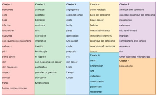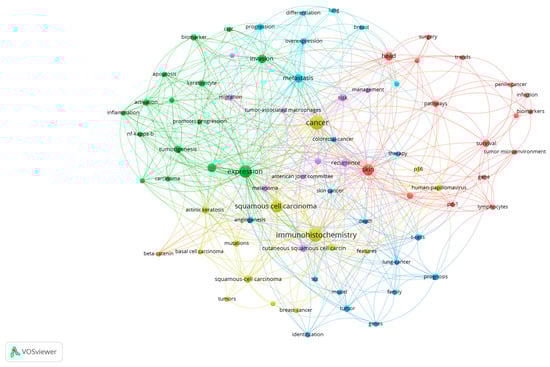 Cluster 1, composed of 16 keywords, shows the strength of the multidisciplinary approach used for cSCCs based on the following keywords: biomarkers, infection, gene, and skin. It also shows direct connections with survival, treatment options (surgery), and trends in finding new perspectives on cSCC management. Cluster 2, composed of 15 keywords, targets cancer diagnostics by establishing a direct connection between the type of cancer, in this case non-melanoma skin cancers; the category in which cSCCs are present; and presenting cell characteristics, such as apoptosis, invasion, keratinocytes, and tumor genesis. Cluster 3 presents a personal and psychological approach, in terms of the patient’s outcome, by selecting and establishing connections between different types of cancers and keywords, such as death and family. By including the keyword “therapy” in this cluster, a greater research interest in the patient outcomes and social integration can be observed. Cluster 4, from the histopathological point of view, defines the intercalation in the research with other non-melanocytic skin cancers, such as basal cell carcinomas (BCCs) of the skin, introducing the necessity of targeted immunohistochemistry for those types of cancers. Regarding cluster 5, it can be observed that the management of cSCCs remains of extremely high interest in research based on the management and recurrence of keywords and according to the American Joint Committee on Cancer. Nevertheless, cluster 6 establishes the role of progression and adequate therapy for this type of cancer in order to avoid metastasis as much as possible, which can affect the breast or even the lungs. Even though cluster 7 is formed by only one keyword, beta-catenin, it has an increased total link strength, which means that it has many connections with other keywords, and by this, it highlights an important research gateway for immunohistochemistry in the diagnosis of cSCCs. As shown in Figure 2 and Figure 3, the clusters observed on the scientometric map have a good distribution, marked by intensive connections between the keyword analyzed.