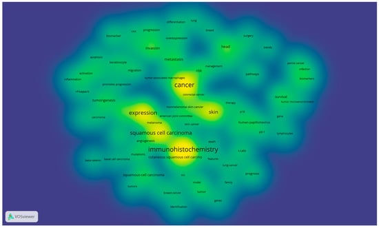 In terms of citations, the density of the citations is represented in Figure 7. By analyzing the conclusions obtained for the selected research articles, our research clusters are supported by the relevant research articles. Our cluster identification and interpretation are validated by the support of the first most-cited research article. According to Satgunaseelan et al., the immunohistochemical assessment of head and neck cutaneous squamous cell carcinomas with p16 is not associated with a better prognosis. The management of the diagnosis and treatment of SCCs must be in accordance with p16 IHC expression []. Riihila et al. demonstrated in their study the importance of complement components C1r and C1s in cutaneous squamous cell carcinomas in terms of progression. This highlights the importance of targeted novel treatments for cSCCs []. Roper et al. showed that PD-L1 expression is usually observed in cSCC primary tumors and in TILs (tumor-infiltrating lymphocytes). Additionally, an expression > 5% in primary tumor cells and primary and metastatic TILs is associated with better survival rates in head and neck cSCCs. [] Wysong et al. demonstrated that their 40-GEP genetic prognostic test, correlated with clinical and pathological findings, may improve the quality of life for the patient, presenting better patient outcomes and adequate treatment and diagnostics []. The results presented by Farshchian et al. in their study show the importance of AIM2 in considering the progression of cSCCs. This can lead to potential targeted therapeutic agents in primary invasive and metastatic cSCCs [].