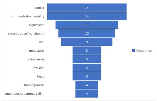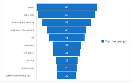 The keywords-review approach was based on the number of occurrences of each keyword, which was analyzed in the present study, and by the total link strength of those words. A descriptive statistic was presented to observe the tendency of using those keywords. It can be observed in Table 1 that a total of 77 keywords were analyzed, for which the maximum occurrence was 14 and the minimum was 2, with a mean rate of occurrence of 3.16. Regarding the total length strength, the minimum length strength was 3, whereas the maximum was 79. Figure 5 and Figure 6 present the 10 most frequently used keywords that had the highest occurrence and greatest total link strength. It can be observed in Figure 5 that cancer and immunohistochemistry are the most commonly used keywords, followed by expression, squamous cell carcinoma, and skin. Although our research query was defined by skin, immunohistochemistry, and squamous cell carcinoma, the keywords “cancer” and “expression” show that, in terms of the research, a great interest is shown in this type of cancer. The knowledge concerning the total link strength is changing in comparison to the occurrences, but the first four links are maintained, as shown in Figure 6. This is explained by the considerable interest of the research in this domain, based on immunohistochemistry and the expression of different parameters of squamous cell carcinomas.