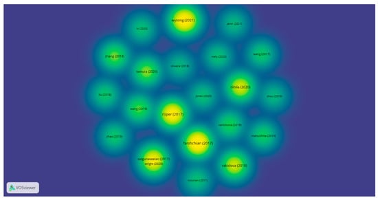 Figure 7 presents the citation density of the selected research articles from the WoS. The intensity of the yellow–green colors represents the higher number of citations for the most-cited research articles out of those that were selected.
