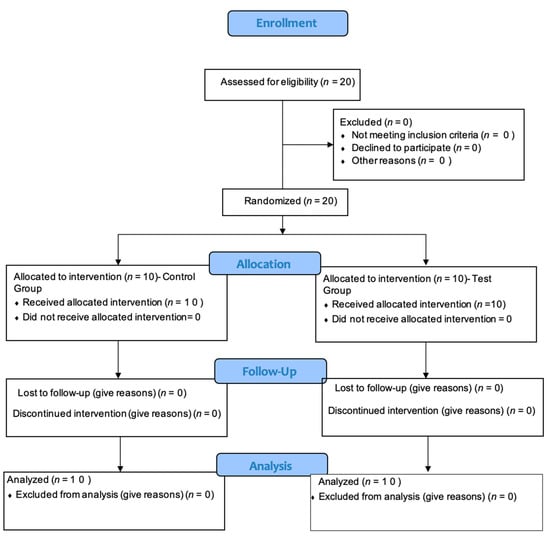The participants of the present study were included based on the study group allocation (Figure 1), and were either systemically healthy (control group) or type II diabetic (test group). The general inclusion criteria included male or female patients aged ≥30 to 60 years, with mandibular premolars and molar edentulous sites with sufficient bone height (at least 13 mm) and sufficient bone width (at least 6 mm). The test group, which included diabetic patients with HbA1c levels of 8.1 to 10 (moderately controlled diabetic individuals) was recruited for the study. The study sample was calculated based on results obtained from a study by Aguilar-Salvatierra et al. in 2016 [17]. Taking a 20% dropout rate into consideration, the sample size was increased to 20 edentulous sites that require implant placements with 10 (LMG) platform switched implants and abutments to be placed in each group.
