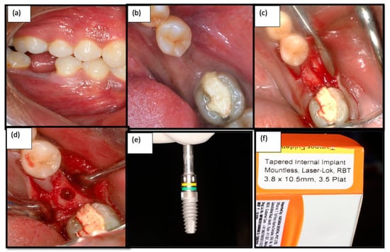 (a) Isolated edentulous site—Buccal view; (b): Intra oral photograph of the edentulous site—Occlusal view (c): Crestal incision given and flap elevation performed (d) final osteotomy site preparation done for 3.8 mm; (e,f) Laser micro-grooved Implants (Laser lok®).