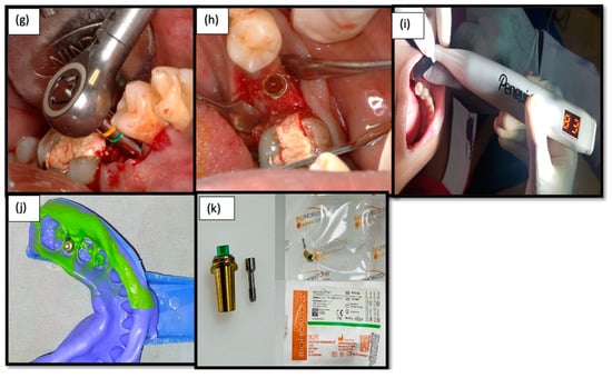 (g) Implant driven in using a Bio-horizon torque wrench; (h) Laser Micro-grooved implant placed and cover screw given; (i) Resonance frequency analysis for prosthetic loading; (j) Putty impression taken for prosthetic restoration; (k) Laser micro-grooved abutment – Laser Lok®.