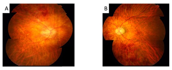 The color photos showed mid vitritis, retinal exudates, and hemorrhage in right eye (A) and left eye (B) both eyes.