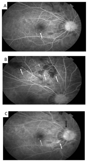 Traditional fluorescein angiography showed aneurysmal dilation ((A), 40 s after the fluorescein injection, arrow) of peripapillary and optic disc retinal arterioles, peripheral capillary nonperfusion ((B), 1 min after the fluorescein injection, arrow), focal inflammation of the optic nerve ((C), 4 min after fluorescein injection, black arrow), peripapillary retina ((C), white arrow), macula ((C), gray arrow), and retinal vasculitis in the right eye.