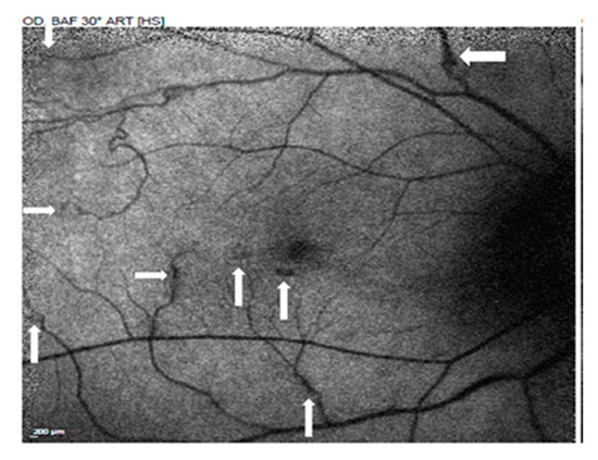 Autofluorescence images highlighted the aneurysmal dilations (arrow) of retinal arterioles and vein tortuosity.