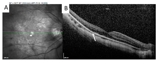 The green line over the infrared red image (A) represents the OCT scan position. High-resolution OCT showed focal disruption of both the ellipsoid and RPE–photoreceptor interdigitation zones ((B), arrow) over the right eye.