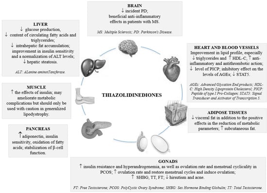 Peroxisome Proliferator-Activated Receptors (PPARs) represent nuclear receptors expressed throughout most of the body, including adipose tissue, liver, skeletal muscle, heart and kidney, and are deputies to the regulation of transcription of genes involved in gluconeogenesis, lipid transport and fatty acid oxidation []. The three PPARs (α, β/δ and γ) have a different tissue distribution: heart, skeletal muscle, brown fat, kidney, colon, liver randomly. Some PPAR agonists are prescribed for the management of T2DM, such as rosiglitazone and pioglitazone []. Table 1 and Table 2 summarize landmark clinical studies and major results achieved with thiazolidinediones. Figure 1 illustrates the mechanisms and pleiotropic effects of thiazolidinediones.