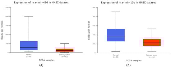 - Nowicka, Z.; Stawiski, K.; Tomasik, B.; Fendler, W. Extracellular MiRNAs as Biomarkers of Head and Neck Cancer Progression and Metastasis. Int. J. Mol. Sci. 2019, 20, 4799. [Google Scholar] [CrossRef]