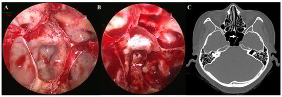 For successful EETSA, the surgeon must have excellent knowledge of the anatomical relationships in the sphenoid sinus and a detailed examination of the preoperative CT is critical to avoid an increased risk of complications during surgery []. However, we identified many cases in which the preoperative CT and intraoperative ISS findings differed. Therefore, the ISS findings should not be unconditionally dependent on CT alone. In our study, a vertical septum on CT was often mistaken for a pseudoclivus. Although a vertical septum was suspected on preoperative CT and removed with a drill or chisel during EETSA, the bony septum in the horizontal dimension was not completely removed, as it might actually be a pseudoclivus mimicking the clivus. Additionally, there may be a ridge that is not identified on CT. A bony ridge attached to the clivus below the sellar floor is useful during EETSA-based surgery to maintain the sphenoid sinus mucosa after elevation. After removing the mass, the elevated sphenoid sinus mucosa can be repositioned without damage.