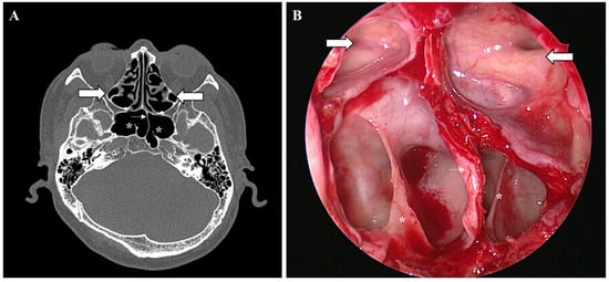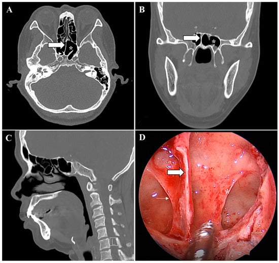 - Fadda, G.L.; Petrelli, A.; Urbanelli, A.; Castelnuovo, P.; Bignami, M.; Crosetti, E.; Succo, G.; Cavallo, G. Risky anatomical variations of sphenoid sinus and surrounding structures in endoscopic sinus surgery. Head Face Med. 2022, 18, 29. [Google Scholar] [CrossRef]