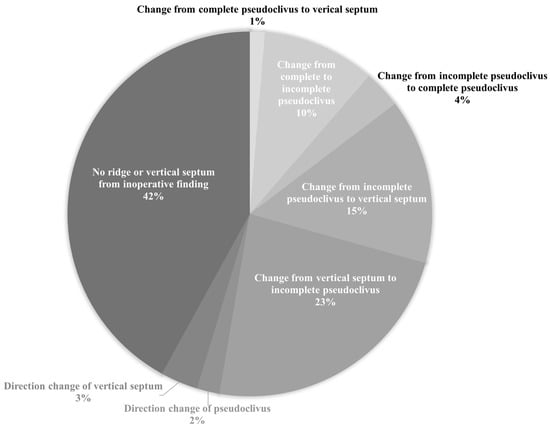 Some differences in estimates of the prevalence of an ISS were observed between the actual intraoperative findings and preoperative PNS CT (Figure 5). ISSs were classified differently based on preoperative PNS CT and the intraoperative findings in 17.1% of the cases (150 of 877 cases). Among them, 72% of the cases involved young patients and 28% involved old patients. In most cases, preoperative PNS CT showed a ridge or vertical ISS that was not identified intraoperatively. The next most common cases involved confusion between an incomplete pseudoclivus and a vertical ISS. A complete pseudoclivus was mistaken for an incomplete pseudoclivus and vice versa in a few cases, and the orientation of blockage of the clivus was inaccurately recorded. The complex ISS configuration was slightly more common in young than in old patients.