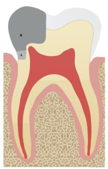 - Dablanca-Blanco, A.B.; Blanco-Carrión, J.; Martín-Biedma, B.; Varela-Patiño, P.; Bello-Castro, A.; Castelo-Baz, P. Management of large class II lesions in molars: How to restore and when to perform surgical crown lengthening? Restor. Dent. Endod. 2017, 42, 240–252. [Google Scholar] [CrossRef] [PubMed]