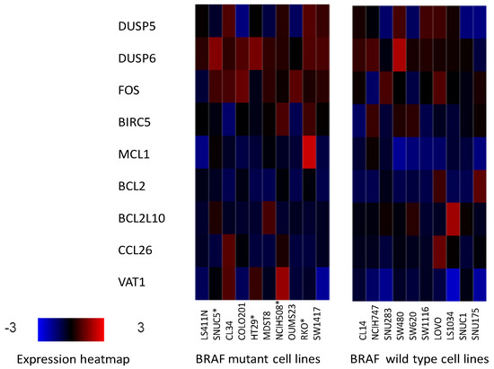 mRNA expression of genes targeted by the BRAF/MEK/ERK pathway (DUSP5, DUSP6, FOS, BIRC5, and MCL1) and genes not directly targeted by the BRAF/MEK/ERK pathway (BCL2, BCL2L10, CCL26 and VAT1) as controls in representative colorectal cancer cell lines with (left panel) and without (right panel) mutations in BRAF. BRAF mutated cell lines with coexisting PIK3CA mutations are shown with an asterisk.
