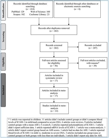 Out of 414 records identified among the databases, after removing duplicates based on title, 263 records remained (Figure 1). Then, 207 irrelevant records were excluded based on title/abstract and 56 full-text articles were further evaluated. Of those 56 publications, 39 articles were excluded. Finally, 17 articles [,,,,,,,,,,,,,,,,] including 22 studies were entered into the meta-analysis.