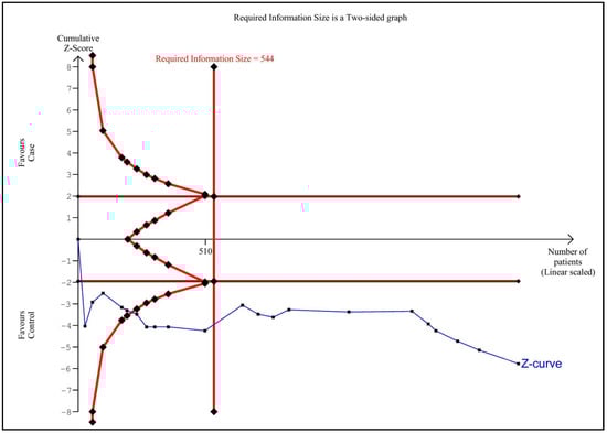 To address false-negative or false-positive results from meta-analyses [], TSA was accomplished using TSA software (version 0.9.5.10 beta) (Copenhagen Trial Unit, Centre for Clinical Intervention Research, Rigshospitalet, Copenhagen, Denmark) []. The required information size (RIS) was computed (alpha risk = 5% and beta risk = 20%) that D2 was 100% for plasma/serum ICAM-1 levels. The mean difference (MD) and variance were based on empirical assumptions constructed automatically by the software. If the Z-curve interrupted the RIS line or the borderline or arrived at the futility zone, enough individuals were located in the studies and the conclusion was reliable.