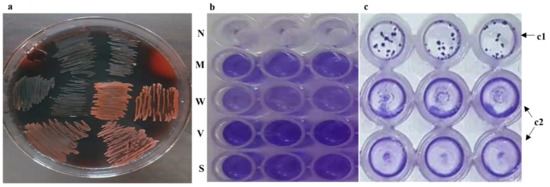 icaADBC operon activity, biofilm categories and biofilm morphotypes. (a) Congo red assay; red: missing and defective icaADBC operon, Dry black: Actively complete icaADBC operon. (b) Microtiter-plate well assay; N: Negative control, M: Moderate, W: Weak, V: Very Strong, S: Strong. OD Cut off values: Biofilm negative: OD ≤ ODC, Weak positive: ODC < OD ≤ 2(ODC), Moderate positive: 2(ODC) < OD ≤ 4(ODC), Strong positive: 4(ODC) < OD ≤ 5(ODC) to 4(ODC) < OD ≤ 9(ODC), Very Strong positive: 9(ODC) < OD. (c) Biofilm morphotypes; c1: Aggregated microcolonies like biofilm, c2: Uniform confluent biofilm mass.