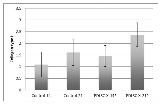 ELISA assessment revealed a surge in the expression of collagen type I for PDLSC-X-14, and PDLSC-X-21 groups, compared to the Control-14 and Control-21 groups (Figure 1). On the 14th day, it was noticed that for the PDLSC-X-14 group, the collagen type I expression was 1.461 ± 0.45, while for the Control-14 group, it was 1.093 ± 0.54. On the 21st day, the collagen type I expression observed for the PDLSC-X-21 group was 2.367 ± 0.51, and for the Control-21 group, it was 1.613 ± 0.57. All the intergroup differences were statistically significant (p < 0.05).