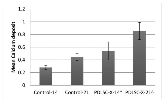 On ARS staining, PDLSC-X-14 and PDLSC-X-21 groups revealed an increased calcium deposition compared to their control counterparts (Figure 2). On the 14th day, it was noticed that for the PDLSC-X-14 group, the calcium deposition was 0.54 ± 0.141, while for the Control-14 group, it was 0.281 ± 0.031. On the 21st day, the calcium levels observed for the PDLSC-X-21 group were 0.855 ± 0.135, and for the Control-21 group, they were 0.447 ± 0.056. All the intergroup differences were statistically significant (p < 0.05) (Figure 3).