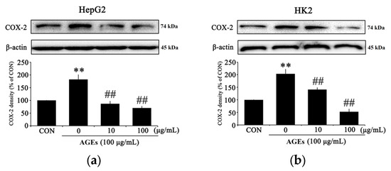 The production of RAGE was assessed by Western blot using HepG2 and HK2 cells treated with AGEs at two concentrations (10 and 100 μg/mL) for 24 h. RAGE production in HepG2 and HK2 cells were confirmed at 100 μg/mL, which was set as the concentration for further experimentation (Figure 2a,b). RAGE production in HepG2 and HK2 cells showed a significant concentration reduction when treated with PC (Figure 2c,d).