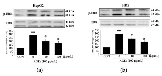 AGEs treatment causes inflammatory conditions by inducing activation of the MAPK pathway, which affects the p38 MAPK pathway. The expression of ERK was significantly reduced in both cell lines after treatment with 100 μg/mL pf PC (Figure 4a,b). The expression of p38, which shows the strongest response to AGEs treatment, was reduced in PC-treated HepG2 cells (Figure 4c,d) and HK2 cells (Figure 4c,d). Based on these results, it is judged that PCs affect the inhibition of MAPK pathway activation induced by AGEs and help maintain normal immunity in the body.