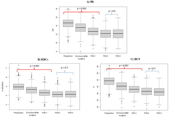 Considering the Hb trend (Figure 1A), the median values in the preoperative day, POD1, POD 2, and POD 3 are 14.7 (IQR = 13.9–15.4), 12.6 (IQR = 11.8–13.4), 12.1 (IQR = 11.2–12.9). and 12.2 (IQR = 11.2–13.1), respectively. The ∆ between preoperative day and POD 1 is 2.0 (p < 0.001). The ∆ between preoperative day and POD 2 is 2.5 (p < 0.001). Conversely, ∆ between POD 2 and POD 3 is 0.5 (p = 0.6).