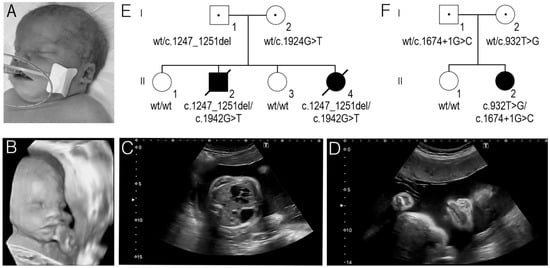 (A) The facial view of the second affected newborn in family 1 (F1.II-4). (B–D). A 3D ultrasound image of the second foetus in family 1 (F1.II-4). Note: wide nasal bridge, broad nasal tip, wide mouth, short philtrum (B); Congenital diaphragmatic hernia (C); Wide mouth (D). (E) The segregation of the c.1942G>T and c.1247_1251del PIGN variants in family 1. (F) The segregation of the c.932T>G and c.1674+1G>C PIGN variants in family 2.