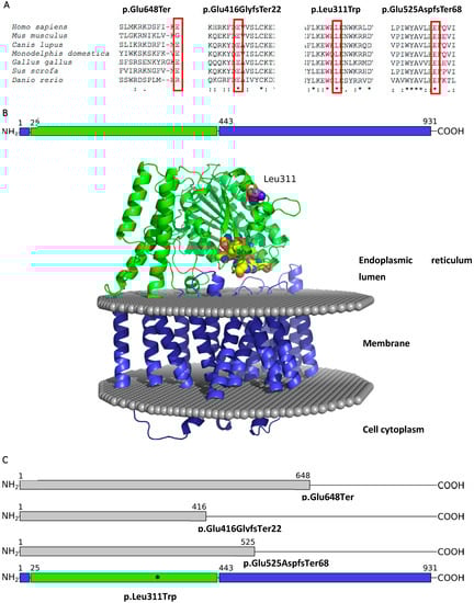 At the protein level, the nonsense c.1942G>T variant and deletion c.1247_1251del cause the premature termination of the PIGN protein: NP_789744.1:p.(Glu648Ter) and NP_789744.1:p.(Glu416GlyfsTer22), respectively. The consequences of the splice site variant c.1674+1G>C on messenger RNA (mRNA) have been previously investigated by McInerney-Leo et al. (2016). The analysis of cDNA revealed that the donor splice site variant causes the skipping of exon 18, and consequently activates a cryptic splice site 55 nucleotides downstream of exon 19 NP_789744.1:p.(Glu525AspfsTer68) []. Therefore, a possible impact on the PIGN protein of these three loss-of-function variants is a truncated and functionally disturbed protein (Figure 2C). Meanwhile, the c.932T>G variant at the protein level replaces leucine with tryptophan at codon 311 NP_789744.1:p.(Leu311Trp) (Figure 2B). Sequence alignment of the PIGN protein in seven randomly selected species revealed that the regions encoded by the analysed c.1247_1251del (p.(Glu416GlyfsTer22)), c.1674+1G>C (p.(Glu525AspfsTer68)), and c.932T>G (p.(Leu311Trp)) variants are highly conserved, while the nonsense c.1942G>T (p.(Glu648Ter)) variant occurs in the non-conservative locus (Figure 2A, Supplementary Figure S2).