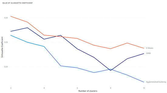 According to the defined methodology, the prepared data has been clustered by each algorithm iteratively into various clusters, starting from 2 clusters and ending in 10 clusters. Each clustering was evaluated using both indicators to identify the optimal number of clusters and the best algorithm. The K-means algorithm achieved the highest value for the Silhouette coefficient with two clusters. The value achieved was 0.3029 (Figure 1).
