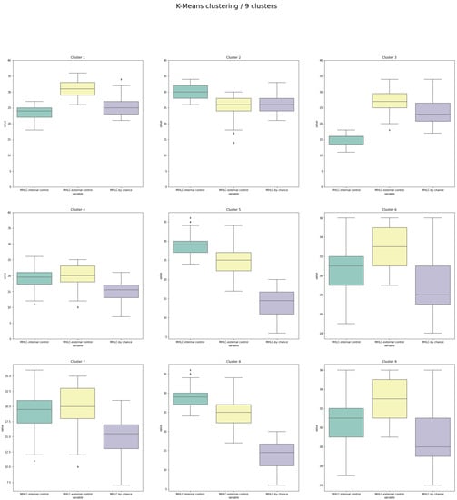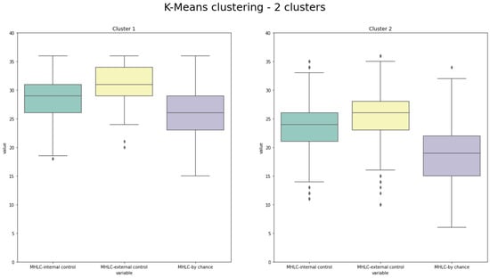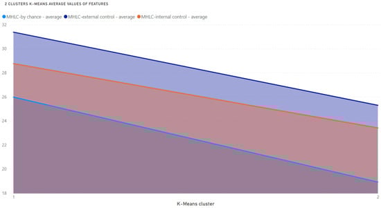 To further analyze the data, the authors selected the results of K-Means clustering with 2 clusters. The distribution of MHLC-internal control, MHLC-external control, and MHLC-by chance is presented in Figure 2.