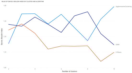 When the Davies-Bouldin index was used to determine the best algorithm and the optimal number of clusters, the lowest value (the best) was achieved by the K-Means algorithm with nine clusters. The value achieved was 1.0399 (Figure 4).