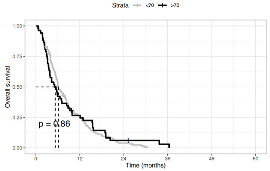 Overall survival (OS) of biliary tract cancer patients receiving second-line chemotherapy. Median OS was 5.7 months in elderly patients and 6.1 months in younger patients (Hazard Ratio 0.97; p = 0.86).